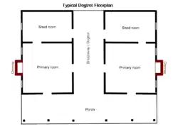 Das Dogtrot-Haus bestand früher aus zwei Blockhäusern unter einem gemeinsamen Dach mit einer dazwischenliegenden Passage (englisch dogtrot oder breezeway). Normalerweise wurde ein Blockhaus zum Kochen und Essen verwendet und das andere zum Schlafen. Es hat meist 1 bis 1½ Stockwerke und mindestens zwei Räume mit jeweils 5,5 bis 6 m Breite, die Türen zu der zentral gelegenen Passage haben. Gelegentlich sind weitere Räume oder Schuppen angebaut, die die Passage vorne oder hinten flankieren.[1][3] Die Passage bot durch die Überdachung Schutz vor der Hitze und eine natürliche Belüftung der danebengelegenen Räume.[5]