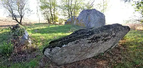 - ↑ Der Dolmen angevin ist eine Allée couverte vom Typ Loire mit (eingezogenem) Trilithenportal als Zugang.
