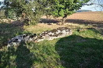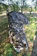 - an der Nordostseite zwei Tragsteine (Nr. IV etwa 4,4 m lang und Nr. V etwa 2,0 m lang und stellenweise 1 m dick),