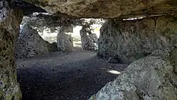 - ↑ Der Dolmen angevin, ist eine Allée couverte vom Typ Loire, mit (eingezogenem) Trilithenportal als Zugang