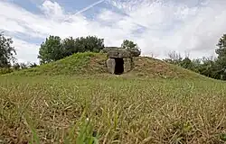 - ↑ Der Dolmen angevin ist eine Allée couverte vom Loire-Typ mit (eingezogenem) Trilithenportal als Zugang.
