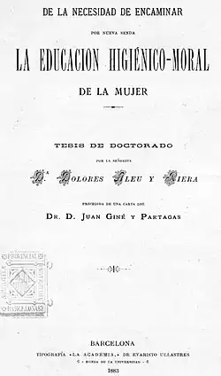 - ↑ Dolors Aleu i Riera: De la necesidad de encaminar por nueva senda la educación higiénico-moral de la mujer. 16. Oktober 1882 (tdx.cat [abgerufen am 12. April 2022] Universitat de Barcelona).