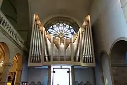 Die Hauptorgel mit 53 Registern wurde 2003 von der Fa. Kuhn (Männedorf, Schweiz) erbaut. Sie ersetzt eine im Südturm in einer Nische akustisch ungünstig platzierte Vorgängerorgel von Franz Breil (1963). Der Standort vor der Rosette ermöglicht eine gute Klangabstrahlung, jedoch war der Platz zwischen der Empore und der Rosette zu klein, um dort ein für diese Kirche ausreichend großes Orgelwerk bauen zu können. Um die Sicht auf das Rundfenster dennoch freizuhalten, wurde die vorhandene Empore abgerissen und etwas tiefer eine neue, auf der die Orgel nun steht, gebaut.[9] Die Spielanlage befindet sich „in“ der Orgel, mittig über der Orgelrückwand, mit Blickrichtung zum Altar. Elektrisch angekoppelt ist ein kleines Turmwerk mit weiteren vier Registern (Kegelladen), das im 1. Stock des großen Südwestturms untergebracht ist. Es ist schwellbar und verfügt über eine Schall-Absorptionskammer.