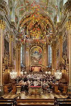Das Innere der Kirche wurde durch Jakob Prandtauer, Joseph Munggenast, Daniel Gran und Bartolomeo Altomonte barockisiert. Die Deckenfresken gestaltete teilweise Thomas Friedrich Gedon.[14] Vor den Stufen des Altarraums befindet sich der Abgang zur Bischofsgruft, in der u. a. die Diözesan- bzw. Weihbischöfe von St. Pölten Memelauer, Žak, Krenn und Fasching beigesetzt sind.