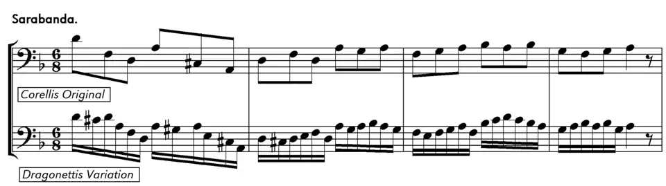 Originalthema der Sarabande aus der Sonata da camera a tre op. 4, Nr. 8 von Corelli und Dragonettis Variation
