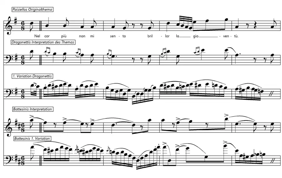 Dragonettis Virtuosenstücke – obwohl bis heute teilweise von technisch höchstem Anspruch – genießen gegenwärtig nicht dieselbe Beliebtheit wie die in dieser Hinsicht noch exklusiveren Werke Giovanni Bottesinis. Dies mag zum Teil dem publikumswirksameren „Belcanto“-Stil des Jüngeren geschuldet sein, ist teilweise aber auch auf die gewandtere, differenziertere Kompositionstechnik Bottesinis zurückzuführen.[35] Das folgende Beispiel vergleicht Ausschnitte der Bearbeitungen, die beide Musiker von Giovanni Paisiellos beliebter Arie Nel cor più non mi sento angefertigt haben.