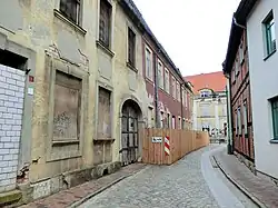 - Zur Domstraße steht das zweigeschossige giebelständige verputzte klassizistische Fachwerkhaus mit einer Attika, die durch seine markanten ovalen Ochsenaugen auffällt. 1788 hatte das Haus zur Domstraße im Obergeschoss eine Beletage mit Parkettboden, repräsentativen Türen und einem Saal.