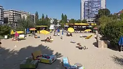 Aufgrund seiner zentralen Lage hat sich der Donaukanal in den letzten Jahren dank zahlreicher Infrastrukturprojekte vermehrt zu einem Freizeit- und Erholungsraum entwickelt. So hat sich 1995 auf dem Vorkai beim Ringturm das Musiklokal „Flex“ und bei der U-Bahn-Station Roßauer Lände 1996 die „Summer Stage“ mit Freiluftausstellungen und -konzerten sowie Gastronomiebetrieben etabliert. 2005 sperrte die "Strandbar Herrmann" auf. Nach 2006 wurde bei der Urania das „Badeschiff“ mit Schwimmbecken und Café-Restaurant in Betrieb genommen. Auch in der benachbarten, 2010 eröffneten „Schiffstation City“, der Anlegestelle des Twin City Liners, wird im „Motto am Fluss“ Gastronomie geboten.[5] An der Einmündung des Wienflusses befindet sich seit 2005 die „Strandbar Herrmann“ mit einem aufgeschütteten Sandstrand. Dem „Flex“ gegenüber besteht seit 2009 der sommerliche „Tel Aviv Beach“. Mehrere jährliche Musikfestivals bieten in den Sommermonaten bis in den Herbst entlang des Donaukanals Konzerte. Seit 2007 findet auf dafür auf den Uferpromenaden errichteten Bühnen und in mehreren Lokalen bei freiem Eintritt das Donaukanaltreiben statt.[6] Im Rahmen des erstmals 2011 veranstalteten Club-Festivals Waves Vienna spielen Bands auf mehreren Booten, darunter im Laderaum des „Badeschiffs“, sowie im „Flex“ und das Jazz Fest Wien hat Konzerte auf der „Summer Stage“ im Programm.