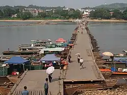 Die Dongjin-Brücke wurde erstmals in der Song-Dynastie (960–1279) gebaut und seitdem immer wieder erneuert. Sie ist eine der wenigen chinesischen Schiffbrücken, die die Zeiten überdauert haben.