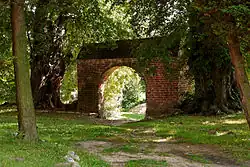 Zum Betreten des Kirchhofs rund um die Kirche schreitet man auch heute noch durch den mächtigen Rundbogen eines Portals mit einer Kreisblende. Ehemals breitete eine weitausladende Linde ihr Laubdach über den Friedhof.