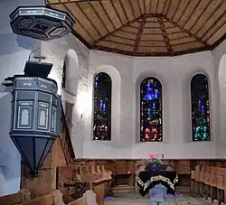 Die Innenausstattung ist von den weiss getünchten Aussenwänden abgesehen ganz aus Holz, die Decke braun, verziert mit Bändern mit rot bemalten geschnitzten Rankenmustern. Die Kanzel ist hellblau und weiss, die Empore in Grautönen bemalt. Die Empore wird von braunen Holzpfeilern getragen, die in der Form an gotische Steinpfeiler erinnern.