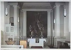 Das klassizistische Altarretabel hat einen wandförmigen Aufbau, der um 1900 von Franz Schwechten gestaltet wurde. Er gliederte die Fläche durch Pilaster und brachte im Altarblatt ein Gemälde an. Es stammt von Gregor Boldio, der 1631 in Anlehnung an ein Original von Peter Paul Rubens die Kreuzabnahme darstellte. Das Gemälde wurde 1859 vom Berliner Portraitmaler Eduard Wilhelm Kriesmann sowie 2011 von Grit Jehmlich aus Potsdam restauriert. Zur weiteren Kirchenausstattung gehören ein hölzernes Kruzifix aus dem 17. Jahrhundert sowie ein ebenfalls hölzernes Epitaph, das an den 1721 verstorbenen Jost Friedrich Rudolf von Wulffen erinnert. Hierzu gehören auch zwei Reliefgrabsteine aus dem Jahr 1612, die die Verstorbenen figürlich in ihrer Rüstung zeigen. Ein weiterer Grabstein wurde für den 1620 verstorbenen Curt von Wulffen und seine Ehefrau Elisabeth aufgestellt. Eine an der Südwand befindliche Wappenkartusche aus Stuck stammt aus dem Jahr 1734 und erinnert an die von Finckenstein. An der Nordseite der Turmhalle befindet sich eine gusseiserne Ofenplatte aus dem Jahr 1598. Sie zeigt eine Allegorie der Vanitas und Szenen aus dem Gleichnis des Schalksknechts.