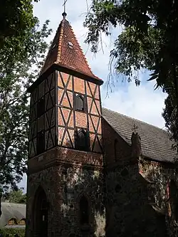 Die neugotische Saalkirche schließt nach Osten dreiseitig.[3] Sie steht auf rechteckigem Grundriss und wurde aus gehauenen Feldsteinen errichtet.[4] Von 1883 bis 1893 (in einer anderen Quelle ist als Bauzeit 1889 bis 1893 angegeben[5]) wurde sie aus Feld- und Backstein errichtet.[3] Die Außenwände sind durch mehrere Stützpfeiler und spitzbogige hohe Fenster mit Backsteinfassungen gegliedert.[6] Das spitzbogige Eingangsportal befindet sich in einem mehrfach gestuften Gewände aus Backstein. In den Innenraum ist eine flache Decke eingezogen, der Raum ist restauriert. Bemerkenswert ist die Backsteinausmauerung im Altarbereich.[7] Auf der rechten Seite steht die offene Patronatsloge für die Familie von Hauff. Das Obergeschoss des angesetzten Westturmes ist in Fachwerk gebaut.[3] Zum Gebäude gehört auch eine beheizbare Winterkirche.[8]