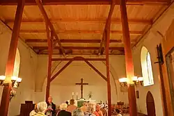 Der Innenraum wird durch eine Balkendecke, die auf sechs Holzträgern ruht, überspannt. Die Winterkirche wurde 1950 bei der Umgestaltung des Inneren eingerichtet.