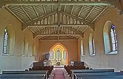 Das Kirchenschiff hat einen rechteckigen Grundriss. Die Ostwand ist geschlossen, im mit Fialen verzierten Giebel sind zwei kleine, gekuppelte Spitzbogenfenster, darüber am Dachfirst ein kleines Kreuz. An der Nordseite befinden sich vier große und ebenfalls spitzbogenförmige Fenster, die in einem dreifach getreppten Gewände verbaut wurden. Die Südwand ist identisch aufgebaut.