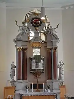 Im Inneren ist das Bauwerk flachgedeckt und wird durch die einheitliche Ausstattung bestimmt. Im Saal sind zweigeschossige Emporen eingebaut, an der Chornord- und -südseite sind zweigeschossige Logen angeordnet, die mit Korbbogenöffnungen zum Chor versehen sind.