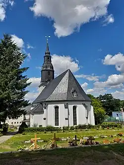 Die große Saalkirche mit mehrfach gegliedertem Turmaufsatz wurde in den Jahren 1732–1736 anstelle des Vorgängerbauwerks erbaut; der Westturm stammt aus dem Jahr 1775. Restaurierungen erfolgten in den Jahren 1833 und 1933. Das Bauwerk ist ein Putzbau mit dreiseitig geschlossenem Chor. Das gotisierende Äußere wird durch Strebepfeiler und hohe schmale Fenster geprägt und durch einen stattlichen Westturm mit reich gegliederter Haube akzentuiert.