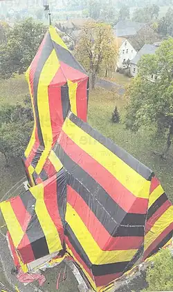 Im Jahre 2013 wurde die Kirche, die von Holzwürmern befallen war, unter einer (schwarz-rot-goldenen) Folie hermetisch nach außen abgeschlossen und begast.
