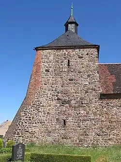 Nach einem Teileinsturz im Mittelalter erhielt er zwei schräge Stützmauern im Westen in Klosterformatziegeln.[3] Die Giebel von Schiff und Chor wurden ebenfalls in Backstein erneuert; die großen Rundbogenfenster stammen vermutlich vom Ende des 19. Jahrhunderts. In der ursprünglichen Form sind das südliche Rundbogenportal und die Apsisfenster erhalten, eine Priesterpforte im Chor weist Erneuerungen am Gewände in Backstein auf.[2] Ein ehemaliges Portal auf der Nordseite ist vermauert.[3] Das Innere ist flachgedeckt und wurde 1976 restauriert. Zwischen Turm und Schiff vermittelt eine große, jetzt zugesetzte Rundbogenöffnung. Ein breiter rundbogiger Triumphbogen verbindet den Chor mit dem Schiff. Im Westen ist eine Empore eingebaut. Die Sanierung des Kirchendachs konnte 2024 abgeschlossen werden.[4]