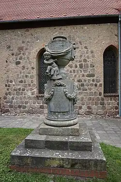 Ein Sandsteinepitaph für Heinrich Julius von Goldbeck († 1818) und seine Frau († 1816) mit Reliefmedaillons der Köpfe aus Marmor 1820 von Johann Gottfried Schadow ist weiter zu erwähnen. Außen an der Sakristei finden sich zwei Inschriftgrabsteine von 1734 und 1744. Im Süden ist ein Urnengrabmal im Zopfstil für Carl Wilhelm Börger († 1793) aufgestellt.