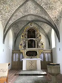 Geputzte Wandflächen auf den Gewölben zeigen, dass der Chor ursprünglich flach gedeckt war. Er besitzt ein Kreuzrippengewölbe mit Kappen und Birnstabrippen. In der Turmhalle befindet sich eine Glocke mit Minuskelschrift, diese stammt wahrscheinlich aus dem 15. Jahrhundert.