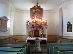 Das Innere wird von einer Putzdecke mit flacher Voute abgeschlossen. In den Querflügeln und im Westen sind leicht vorschwingende Emporen eingebaut.