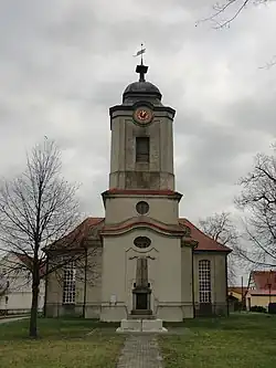 Die Kirche liegt leicht erhöht auf dem Anger des Dorfes und wurde als verputzter Zentralbau in den Jahren 1756/1757 über kreuzförmigem Grundriss erbaut. Die Patronatsherren waren zu dieser Zeit die von Zieten, nach 1775 unterstand die Kirche der Krone mit dem Kompatronat derer von Zieten. Sie wird von einem dreifach abgesetzten, wirkungsvoll gegliederten Westturm mit einer niedrigen Schweifhaube akzentuiert und ist von Walmdächern gedeckt. Die drei Portale sind mit geschwungenen Verdachungen versehen, das Bauwerk wird von hohen Sprossenfenstern mit Stichbogen und Schlussstein erhellt. Der hölzerne Vorgängerbau von 1643 wurde 1755 abgebrochen. Die heutige Kirche wurde 1898 durch Theodor Prüfer restauriert, wobei die Ostempore in den Westen versetzt, eine Sakristei eingerichtet und das Bauwerk neu ausgemalt wurde. Im Jahr 1944 wurden durch Bomben die Kirchenfenster zerstört.