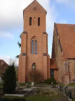 Der Westgiebel ist mit schlanken Spitzbogenblenden versehen. Bis 1842 stand ein freistehender hölzerner Glockenturm davor, der abgebrochen wurde. Mit Rücksicht auf den Blendenschmuck des Westgiebels hatte sich 1844 Landrat Theobald von Böhl beim Bau des neuen mehrgeschossigen Backsteinturms entschlossen, diesen einige Meter abrücken zu lassen und seitlich durch eine Vorhalle mit dem Kirchenschiff zu verbinden. Bei der notwendigen Turmsanierung bekam das querliegende Satteldach 2005 einen Wetterhahn.