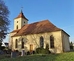 Das Gebäude ist ein barocker Saalbau aus den Jahren 1776/1777. Sie wurde anstelle eines abgebrannten Baus aus dem 14. Jahrhundert errichtet. Die Kirche hat ein nach Osten abgewalmtes Satteldach. Der Westquerturm ist eingezogen und besteht aus dem mittelalterlichen Feldsteinmauerwerk der Vorgängerkirche und einem barocken quadratischer Turmaufsatz mit Pilastergliederung, rundbogigen Schallöffnungen und darüber liegenden Rundfenstern. Die Turmhaube ist ein Zeltdach mit Wetterfahne aus der Bauzeit. Sowohl das Kirchenschiff als auch der gesamte Turm waren verputzt. Bei der Renovierung nach einem Blitzschlag wurde das Feldsteinmauerwerk des Turms freigelegt. Das Gebäude hatte ursprünglich an beiden Längsseiten einen Eingang. Der nördliche wurde vermauert.