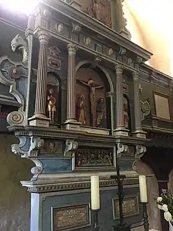 Das hölzerne Altarretabel stammt aus dem Ende des 16. Jahrhunderts und besteht aus einem mehrgeschossigen Aufbau. In der Predella ist das Abendmahl Jesu zu sehen, das von mehreren seitlich angeordneten Putten geschmückt ist. Das Hauptfeld zeigt die Kreuzigung Christi, begleitet von zwei Figuren, die in seitlich angeordneten Muschelfeldern stehen. Die Wangen haben die Form von Adlern. Links und rechts der Wangen ist ein Apostel platziert. Es folgen ein breites Gesims mit vier Putten sowie die Darstellung der Auferstehung Jesu Christi. Oberhalb eines weiteren Gesimses mit zwei Putten ist in einem säulenumrahmten Giebel die Himmelfahrt dargestellt, darauf ein Pelikan. Die Kanzel an der nördlichen Wand des Kirchenschiffs wurde Anfang des 17. Jahrhunderts aus Holz angefertigt. Der polygonale Kanzelkorb ist mit Ecksäulchen und Akanthus verziert. Links neben der Kanzel steht eine hölzerne Fünte vor einer Sakramentsnische in der nordöstlichen Chorwand.