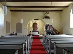 Im Innern ist der Raum durch eine flache Holzbalkendecke geschlossen; ein enger Triumphbogen mit Kämpfergesimsen gliedert den Raum. Das Turmerdgeschoss ist durch ein Quertonnengewölbe geschlossen; dieser Raum war ehemals durch Rundbogen mit dem Schiff verbunden. Im Jahr 1852 wurde der Bogen teilweise vermauert und eine Tür eingebaut. Das Turmobergeschoss war ursprünglich nur vom Schiff aus zugänglich; dieser Zugang ist jetzt vermauert.