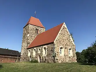 Das Kirchenschiff hat einen rechteckigen Grundriss. Die nördliche Seite ist fensterlos. An der Südwand ist neben dem Chorfenster ein kleines, hochgesetztes Rundbogenfenster. Darunter ist eine spitzbogenförmige Pforte, deren Gewände aus Mauerstein errichtet wurde. Das Türblatt stammt wie auch seine Beschläge aus dem Mittelalter. Nach Westen folgen zwei weitere Fenster, dazwischen linksmittig eine ebenfalls spitzbogenförmige Pforte mit einem Gewände aus Raseneisenstein. Das Dach ist mit Biberschwanz gedeckt.