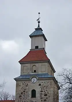 Der rechteckige Feldsteinbau mit leicht eingezogenem Westturm stammt aus dem 14. Jh. Er hat kein Westportal, sondern eine spitzbogige Tür in höherer Blende auf der Südseite des Turms.