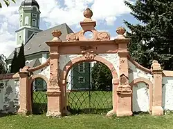 Der Friedhof ist von Resten einer Wehrmauer umgeben, in der mehrere Schießscharten erhalten sind. Das barocke Portal ist mit einem geschweiften Giebel und Kugelzier versehen.