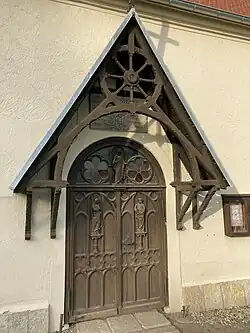 Die Eingangstür der Kirche weist filigran ausgearbeitete Schnitzfiguren auf, darüber befindet sich eine lateinische Inschrift aus dem Jahr 1688. An der Orgelempore erinnern Wittenberger Fakultätswappen von 1503, 1507 und 1607 an den Umstand, dass das Dorf früher der Universität Wittenberg gehörte.