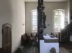 Das Bauwerk wurde im Wesentlichen aus Feld- und Mauersteinen errichtet, die anschließend verputzt wurden. Der Chor ist gerade und stark eingezogen. An der Ostwand sind drei kleine Rundbogenfenster, die zurückversetzt in die Wand eingesetzt wurden. Im Giebel ist ein mittig ein bienenkorbförmiges Fenster, darüber eine kreisrunde Öffnung. An der Chornordseite ist ein schmales, ebenfalls rundbogenförmiges Fenster, während an der Chorsüdseite eine hölzerne Pforte verbaut wurde.
