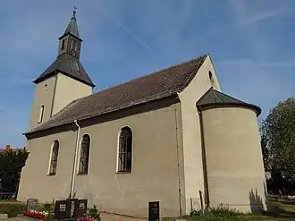 Das Bauwerk ist vergleichsweise schlicht gehalten: Der gesamte Baukörper ist verputzt; an der Nord- und Südseite des Kirchenschiffs sind drei rundbogenförmige Fenster. Die Chorwand ist ebenfalls verputzt, daran schließt sich die einzogene, kreisrunde Apsis mit einem kegelförmigen Dach an. Im Chorgiebel ist eine kleine, kreisrunde Öffnung. Der quadratische und eingezogene Westturm besitzt ein ebenfalls rundbogenförmiges Portal. In Höhe der Traufe des Kirchenschiffs ist an jeder zugänglichen Seite ein kleines Fenster mit einer darüber liegenden, kreisförmigen Blende. Daran schließt sich ein stumpfes Pyramidendach mit einem Dachreiter an, in dem an jeder Seite eine Klangarkade zu sehen ist. Es folgt ein weiteres, steileres Pyramidendach mit Turmkugel und Kreuz.