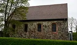 Die kleine Feldsteinkirche entstand im Jahr 1730. Sie hat keinen Kirchturm, verfügte jedoch ursprünglich über einen Dachreiter mit barocker Haube. Der Dachreiter wurde im 20. Jahrhundert im Zuge einer Erneuerung der Kirche abgetragen. Der Grundriss des Kirchbaus ist rechteckig. Eine ursprünglich bestehende Verputzung wurde Anfang des 21. Jahrhunderts entfernt. Der Zugang zur Kirche erfolgt über ein von Pilastern gerahmtes Portal an der Westseite. Über dem Portal befindet sich ein Dreiecksgiebel mit Kartusche. In der Kartusche ist das Monogramm des 1748[1] verstorbenen Bauherren L. F. von Thümen zu erkennen. Sein mit einer Relieffigur versehener Grabstein befindet sich an der Südwand. Bedeckt ist der Bau mit einem noch bauzeitlichen Satteldach.