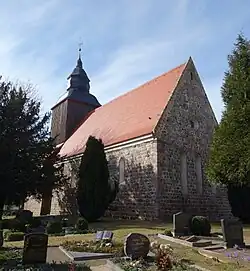 Im Turm steht ein steinernes Grabdenkmal in Vasenform für Caroline von Anhalt († 1780) auf sich verjüngendem Sockel mit Wappen. Ein Taufengel vom Anfang des 18. Jahrhunderts stammt aus Malchow. In der Kirchhofsmauer ist ein Feldsteinportal mit breiter Spitzbogenöffnung aus dem 15. Jahrhundert eingebaut.