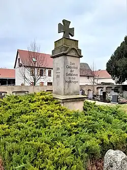 Auf dem Kirchhof befindet sich ein schlichtes, mit dem Eisernen Kreuz bekröntes Kriegerdenkmal aus Sandstein, errichtet für die Gefallenen des Ersten Weltkrieges, das später mit einer Inschrift auch den im Zweiten Weltkrieg Gefallenen gewidmet wurde.