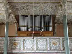 Das Innere wird durch eine flach verschalte Holzdecke geschlossen, deren beide Unterzüge im Schiff auf achteckigen Holzsäulen ruhen; sie sind bemalt in vegetabiler Ornamentik des Jahres 1909; im Turm ist ein Quertonnengewölbe eingezogen. Ein runder Triumphbogen mit romanischen Kämpfern gliedert den Raum.