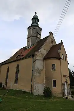 Die nach Zerstörung des im Kern spätromanischen, spätgotisch erneuerten Vorgängerbauwerks im Dreißigjährigen Krieg barock wiederaufgebaute Saalkirche wurde in den Jahren 1685/94 und 1889 erneut umgebaut. Das Bauwerk ist ein verputzter Bruchsteinbau, der noch den eingezogenen quadratischen Chor mit halbrunder Apsis des romanischen Kernbauwerks enthält. Die Spitzbogenfenster des Langhauses stammen in ihrer heutigen Form aus dem Jahr 1685, das Satteldach und der Dachreiter aus Holz vom Ende des 17. Jahrhunderts. An der Chornordseite sind Logen angebaut, mit einem Steinrelief mit dem Wappen derer von Nostitz und der Jahreszahl 1691 bezeichnet, an der Südwand des Saales ein Spitzbogeneingang mit profiliertem Gewände, im Westen ein schmales Eingangsbauwerk mit abgerundeten Ecken aus dem 19. Jahrhundert.