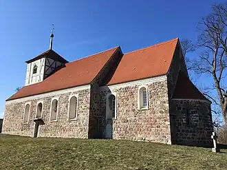 Der querrechteckige Westturm ist rund vier Meter lang und nimmt die volle Breite des Kirchenschiffs auf. Zwischen verputzten Flächen sind Ausbesserungsarbeiten aus Feldsteinen erkennbar, die nicht mehr behauen wurden. Zwischen zwei mächtigen Strebepfeilern aus Feldsteinen befindet sich eine rundbogenförmige Pforte mit einem Binder aus rötlichem Mauerstein. Aus diesem Material wurde auch der Westgiebel errichtet. Er wird von zwei übereinander angeordneten, gedrückt-spitzbogenförmigen Klangarkaden dominiert. Der übrige Aufsatz wurde Ende des 19. Jahrhunderts in Fachwerk neu errichtet. Zwischen dem Gefach ist an der Nord- und Südseite je eine weitere Klangarkade. Das Pyramidendach schließt mit einer Turmkugel und einem Stern ab.