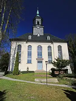 Die beachtenswerte Saalkirche im späten Barock zeigt eine zentralisierende Tendenz im Innern und hat eine Ausstattung im Biedermeierstil erhalten. Sie wurde in den Jahren 1821/22 als Ersatz für das baufällige Vorgängerbauwerk in leicht nach Süden herausgerückter Lage nach Entwurf von Johann Traugott Lohse erbaut. Restaurierungen wurden in den 1960er Jahren im Innern, 1980/82 außen und 1997 innen durchgeführt. Das Bauwerk ist ein Putzbau mit steilem Walmdach und reich gegliedertem Dachreiter. Die wohlproportionierten Fassaden werden durch gestreckte Rundbogenfenster und Risalite bestimmt. Das Innere zeigt eine zentralisierende Wirkung durch die umlaufenden zweigeschossigen Emporenarchitekturen, die an den Schmalseiten als verglaste Logen ausgebaut sind. Die Brüstungsbemalung mit Girlanden und Kränzen wurde von Johann Georg Gottlob Dosten aus Lungwitz ausgeführt.
