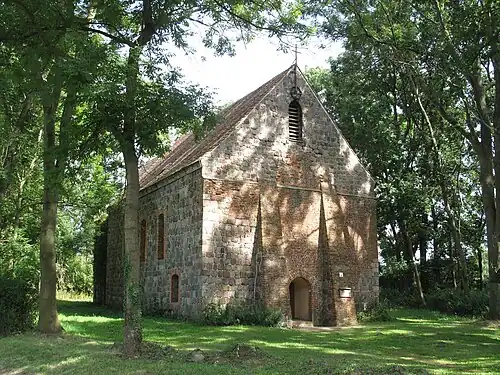 Die denkmalgeschützte Feldsteinkirche aus dem 13. Jahrhundert besteht aus einem rechteckigen Schiff, eingezogenem Chor und halbrunder Apsis. Ursprünglich ein Bau vollständigen Typs, wurde der Kirchturm 1829 abgetragen. Die Glocke hängt heute in einem hölzernen Glockenschauer neben der Kirche. Das Gotteshaus weist im Außenmauerwerk die ungewöhnlich hohe Anzahl von sieben Schachbrettsteinen sowie einen in der Region einmaligen Stein mit einem Jerusalemkreuz auf.
