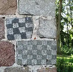 In Grunow befinden sich sechs grüne, blaue und rote Schachbrettsteine, darunter zwei Ecksteine, an der Nordwestecke der Kirche in der von unten fünften, sechsten und siebten (sichtbaren) Feldsteinlage. Ein weiterer Stein liegt in der Chor-Nordwand über der zugemauerten Pforte. Der Jerusalemstein verziert die Westseite des nördlichen Stützpfeilers. Da er sich neben dem zerstörten Westportal befindet, geht Matthias Friske davon aus, dass der Stein ursprünglich über dem für feierliche Anlässe genutzten Westeingang saß. Zumindest dieser Stein wurde also sekundär verbaut.[12] Das Jerusalemkreuz, Zeichen des Ritterordens vom Heiligen Grab zu Jerusalem und heute beispielsweise auch als Logo des Deutschen Evangelischen Kirchentags verwendet, ist ein gemeines beziehungsweise griechisches Kreuz, bei dem in den vier Quadranten nochmals jeweils ein kleineres griechisches Kreuz angeordnet ist. Die fünf Kreuze symbolisieren Christus und die vier Evangelisten oder die fünf Wunden Christi.