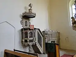 Die hölzerne Kanzel mit Portal, Beichtstuhl, Aufgang und Schalldeckel stammt ebenso wie die Westempore aus dem 17. Jahrhundert. Der Beichtstuhl ist mit einem Bild bemalt, das die Begegnung Jesu mit der Sünderin zeigt (Lk 7,36–50 ). Das Kanzelportal zeigt den Apostel Paulus mit Schwert. Am Kanzelkorb sind die vier Evangelisten abgebildet. Sechs Brüstungsfelder der Westempore zeigen jeweils zwei Apostel, wohl von der gleichen Hand wie von der Kanzel. Der zwölfte Apostel ist der für Judas Iskariot nachberufene Matthias. 1908 wurden die Gemälde restauriert. Eine Sakramentsnische aus der zweiten Hälfte des 13. Jahrhunderts ist mit Tür- und Beschlägen ausgestattet.