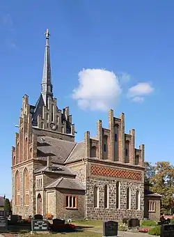 Architekt Salzenberg verwendete bevorzugt gotische Formen und gotisierende Elemente. Die Handwerker verwendeten für den Bau im Wesentlichen Feldstein und Mauerstein. Sie nutzten dabei die vorhandenen Feldsteine bis zur Höhe des Hauptgesimses sowie des Turmunterbaus des Vorgängerbaus. Der Chor ist gerade und nicht eingezogen. Am Chorschluss ist ein Lanzett-Drillingsfenster mit überhöhtem Spitzbogen, daneben jeweils zwei Rundbogenblenden. Die Anhebung der Trauf- und Firsthöhe bedingte die Aufhöhung mit gelbem Glindower Ziegelmauerwerk über den mittelalterlichen Feldsteinen am Ostgiebel. Den Übergangsbereich durchzieht ein breiter Streifen aus Vierpassornamentsteinen, der oben und unten von einem Deutschen Band begrenzt wird. Darüber ist der fünffach gestaffelte Blendengiebel. In den drei mittigen Blenden ist je eine hochrechteckige Öffnung. Zum ursprünglichen Teil des Gebäudes gehört der Ostgiebel mit seinen Lanzettfenstern und den eingepassten neun Schachbrettsteinen. Die relativ hohe Anzahl dieser verwendeten Ornamentsteine ist deutschlandweit einzigartig.[2] An der Nord- und Südwand sind je zwei rechteckige Anbauten, von denen der jeweils westlich gelegene erhöht ist und so einen fließenden Übergang zum Kirchenschiff herstellt. Nach Osten sind jeweils drei gekuppelte Spitzbogenfenster. In den jeweils westlich gelegenen Anbauten ist eine Spitzbogenpforte; darüber ein Gesims sowie drei weitere Spitzbogenfenster. Die Anbauten werden als Sakristei genutzt. Im südlichen Anbau befindet sich eine halbkreisförmige Konche. Vermutet wird, dass hier wertvolles Kircheninventar aufbewahrt wurde.[3] Der Chor trägt ein Satteldach, die Anbauten jeweils abgewalmte Dächer.