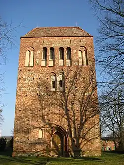 Der altertümlich und wehrhaft wirkende Turm mit querrechteckigem Grundriss wurde erst im 15. Jahrhundert mit dem Glockengeschoss mit rundbogigen Öffnungen und Blenden abgeschlossen, das aus Backsteinmauerwerk unter teilweiser Verwendung von Feldsteinen besteht und mit einem flachen Walmdach gedeckt ist. Der Chor und das Schiff sind durch starke Strebepfeiler abgetrennt.