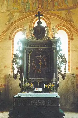 In den Gewölben des Chores sind noch Malereien vom Ende des 13. Jahrhunderts erhalten, die eine Marienkrönung und den Marientod sowie die zwölf Apostel und Maria und Christus zwischen Heiligen thronend zeigen. Sie wurden um 1900 restauriert.